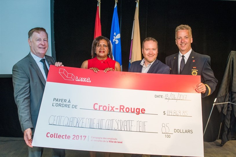 Cette année, les employés, retraités et élus municipaux ont remis la somme record de 114 869,85 $ à la Croix-Rouge, fruit de la 29e campagne de financement organisée par la Ville de Laval. Avec la crue printanière historique vécue à Laval, cette année, cette campagne a assurément pris tout son sens. Voir les bénévoles de l’organisme à pied d’œuvre en sol lavallois pendant plusieurs semaines a sans aucun doute permis aux employés, retraités et élus municipaux de saisir pleinement l’importance d’être généreux pour la cause des sinistrés.
