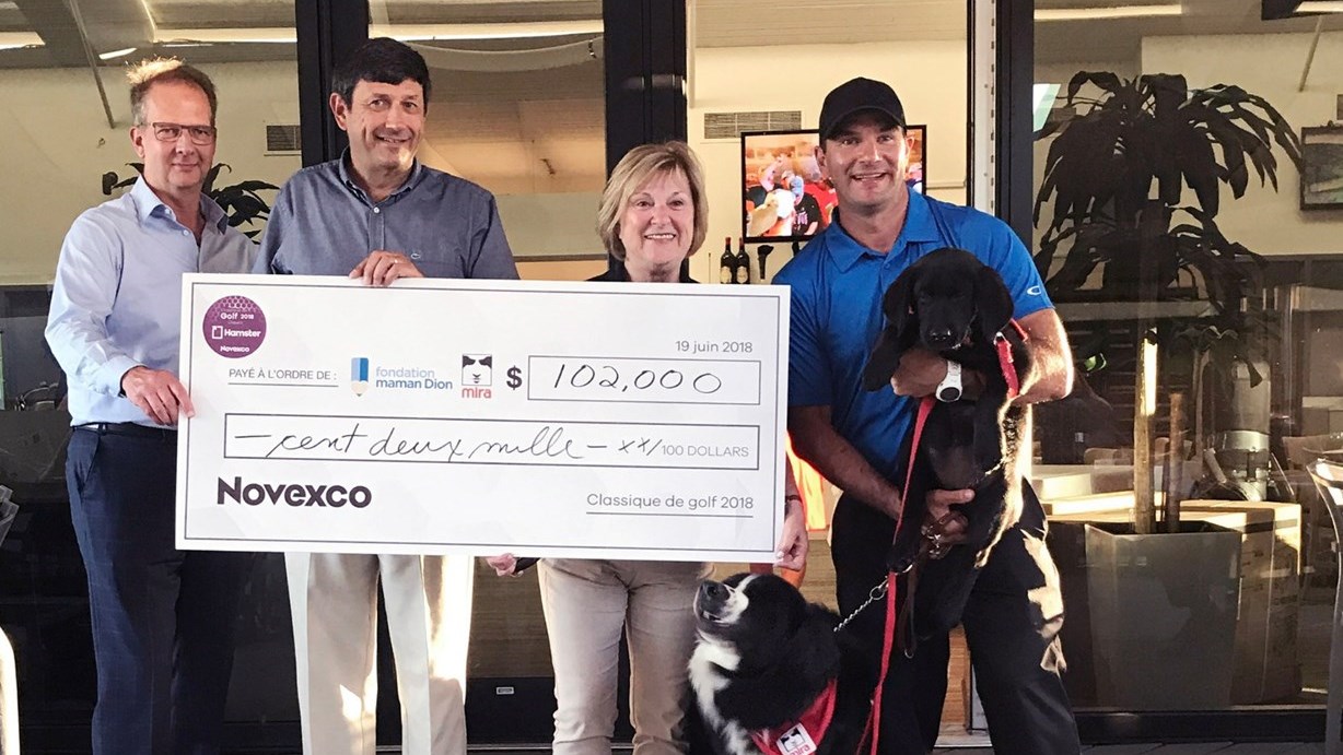 La deuxième édition annuelle de la Classique de golf de Hamster a eu lieu le mardi 19 juin 2018 au Club de golf de la Vallée du Richelieu. C’est avec beaucoup de fierté que Denis Mathieu, président et chef de la direction de Novexco, en compagnie de « maman Dion », Thérèse Tanguay Dion, de Nicolas St-Pierre, directeur général de la fondation MIRA et de 144 partenaires et fournisseurs ont célébré les 102 000 $ récoltés. Cette somme sera versée en parts égales à la Fondation maman Dion et à la Fondation Mira.