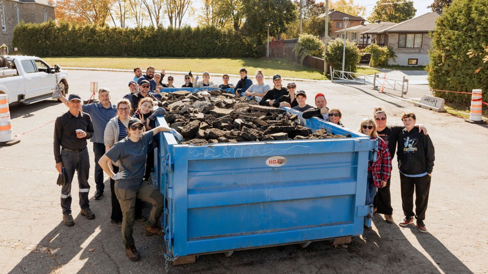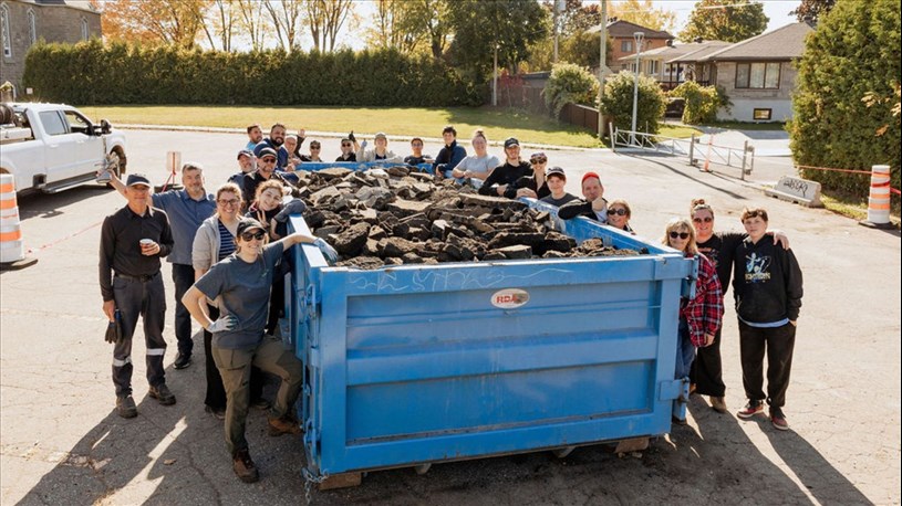 Une vingtaine de bénévoles pour l'organisme CANOPÉE ont participé au retrait de 218 m2 d’asphalte inutilisé sur un terrain appartenant au Centre de la petite enfance (CPE) Le Marmot qui rit situé dans le quartier Chomedey à Laval.